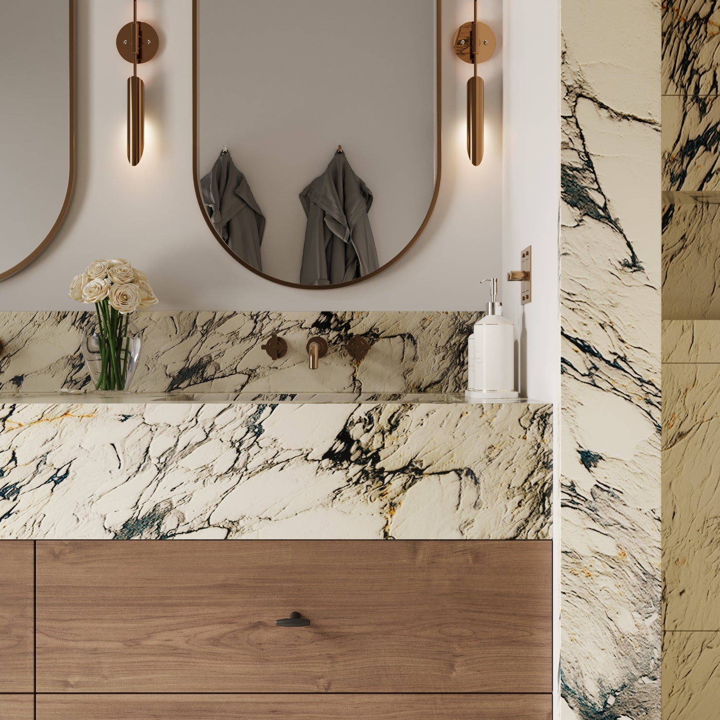 The Breccia Capraia brings the raw drama of Italian marble to life in a durable porcelain format. Bold veining in deep greens and warm golds cuts across a creamy white base, creating the kind of statement surface that turns a bathroom or kitchen into something people actually stop and stare at. The 3D leathered finish adds real texture you can feel under your fingertips, catching and scattering light across the surface in a way that shifts depending on where you're standing. It's a tactile depth that flat polished tiles just can't touch. This is the tile for spaces that refuse to play it safe.